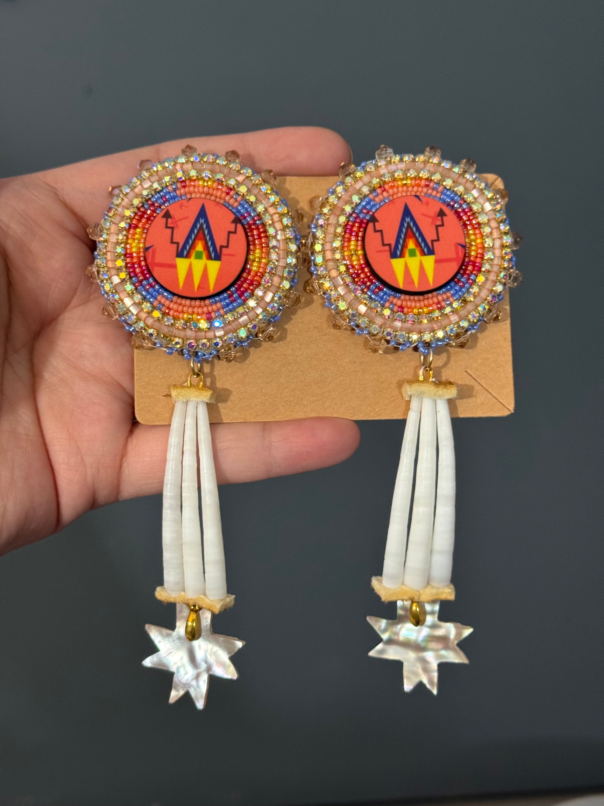 Beaded with size 15 and size 11 satins, backed with smoked hide on fingernail posts. Includes dentallium dangle with custom shaped shell